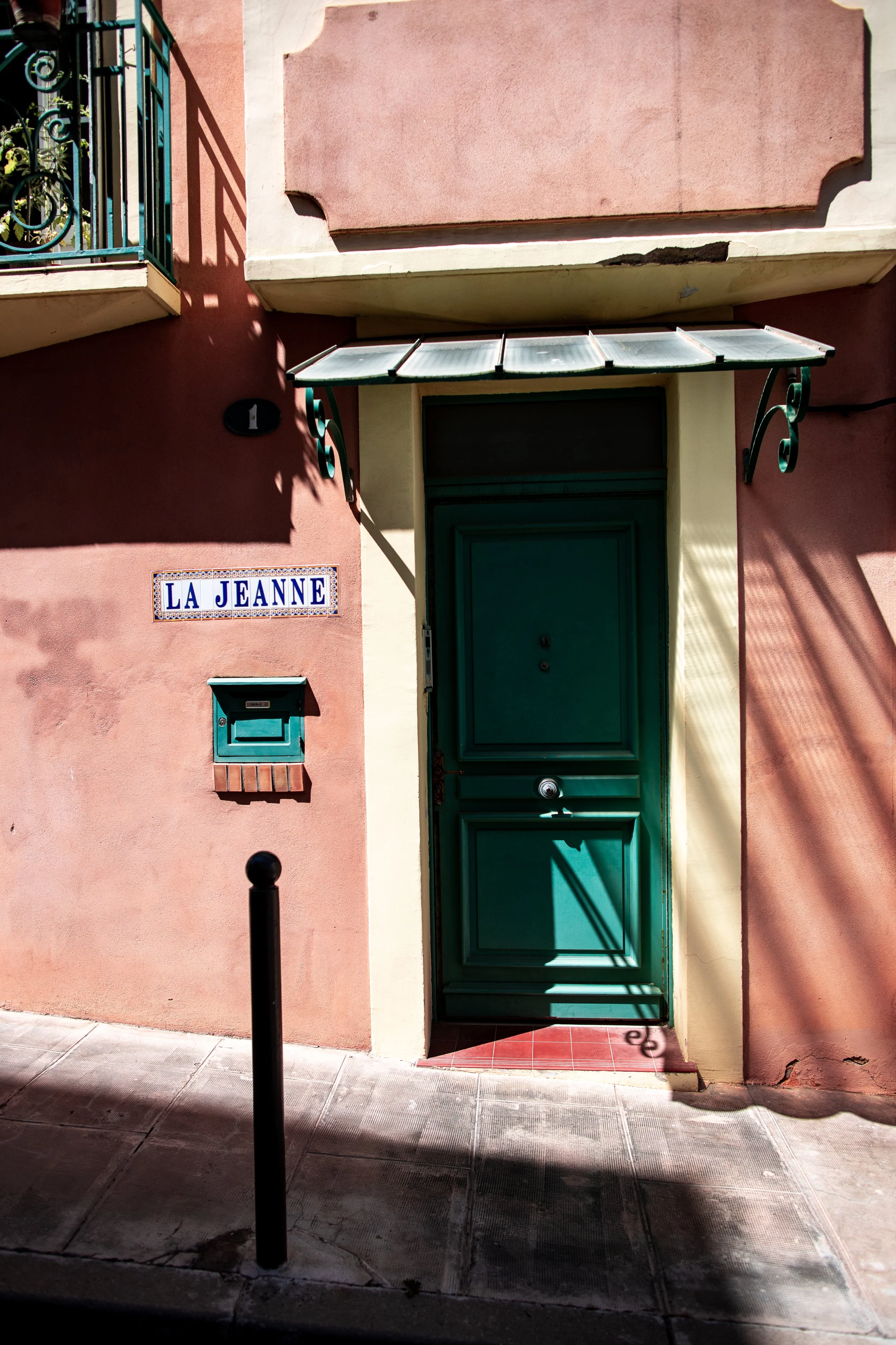 Colorful exterior of a building with a green front door, teal mailbox, a street sign 'LA JEANNE', a balcony, and a shadow cast on the wall.