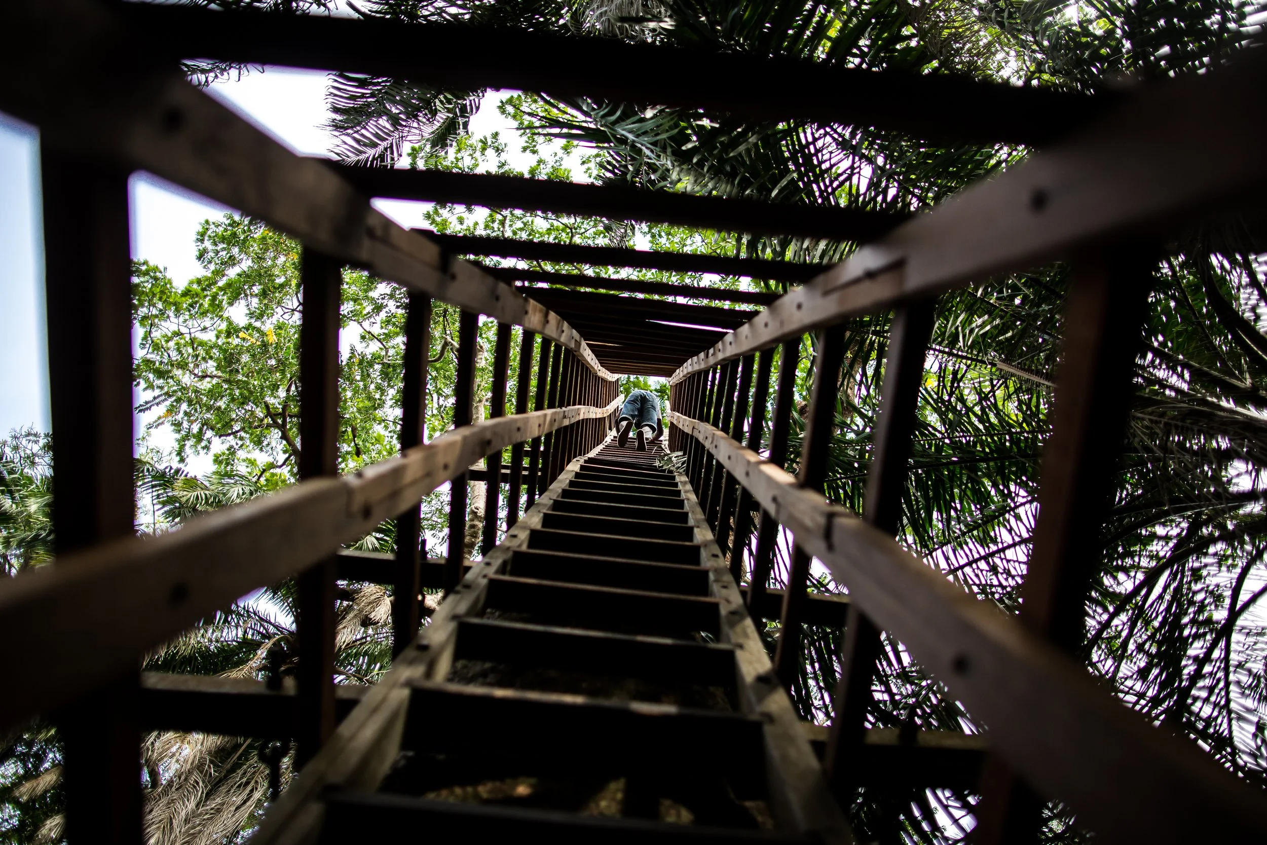 Looking up a wooden ladder through a metal cage in a green, leafy environment, with a person climbing nearby.